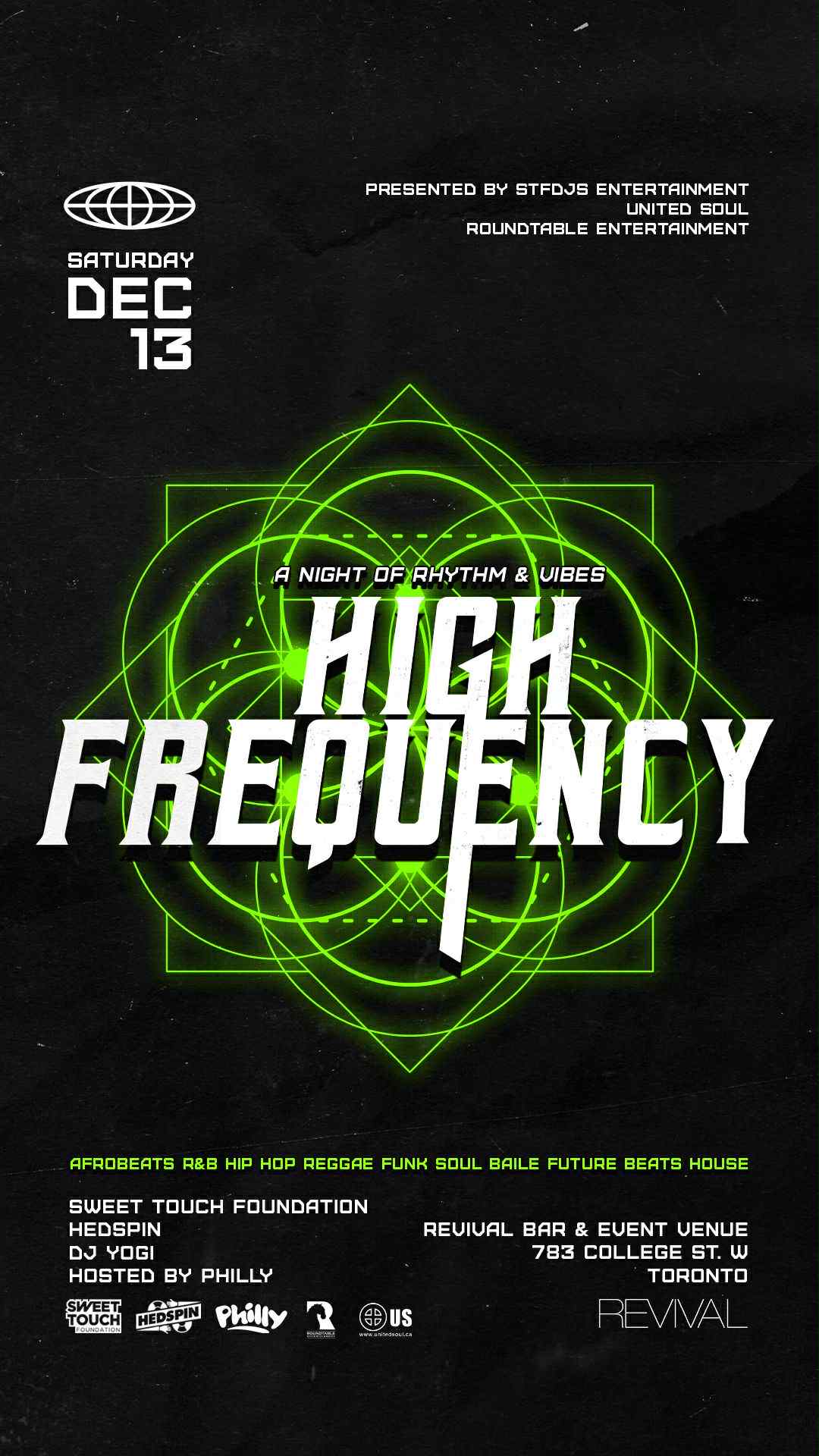 United Soul, STFDJS Entertaiment & Roundtable Entertainment proudly present: H I G H F R E Q U E N C Y Dial up the energy. High Frequency loading… We started the year by raising the vibration at our very first High Frequency party — and now we’re closing out the year by turning it